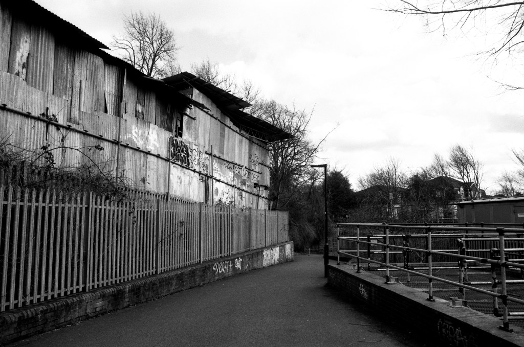 A Stroll Down the Wandle London, 30 February 2020 Pentax K1000, 28mm lens, Kodak T-Max 100 Expired B&W film