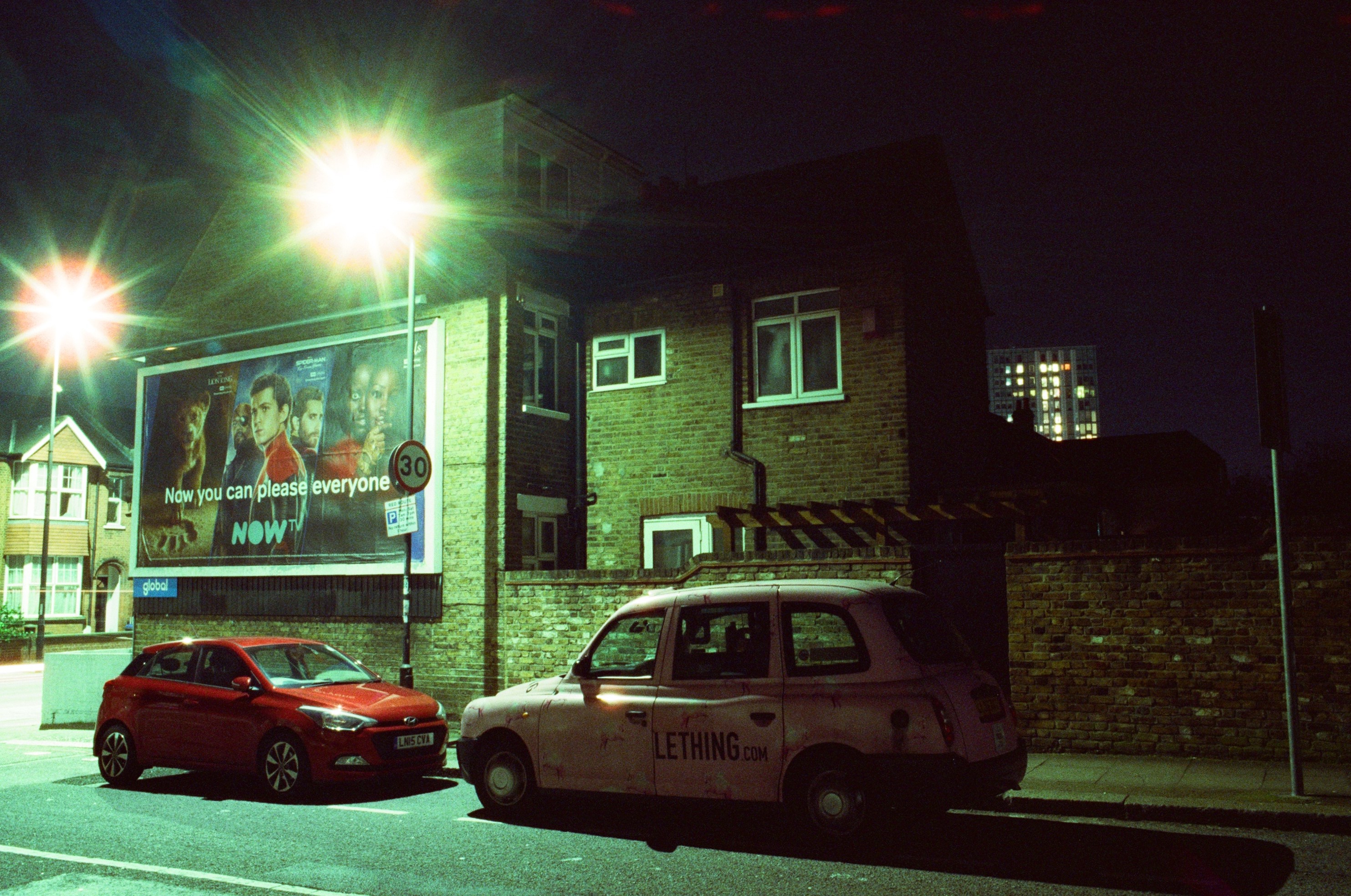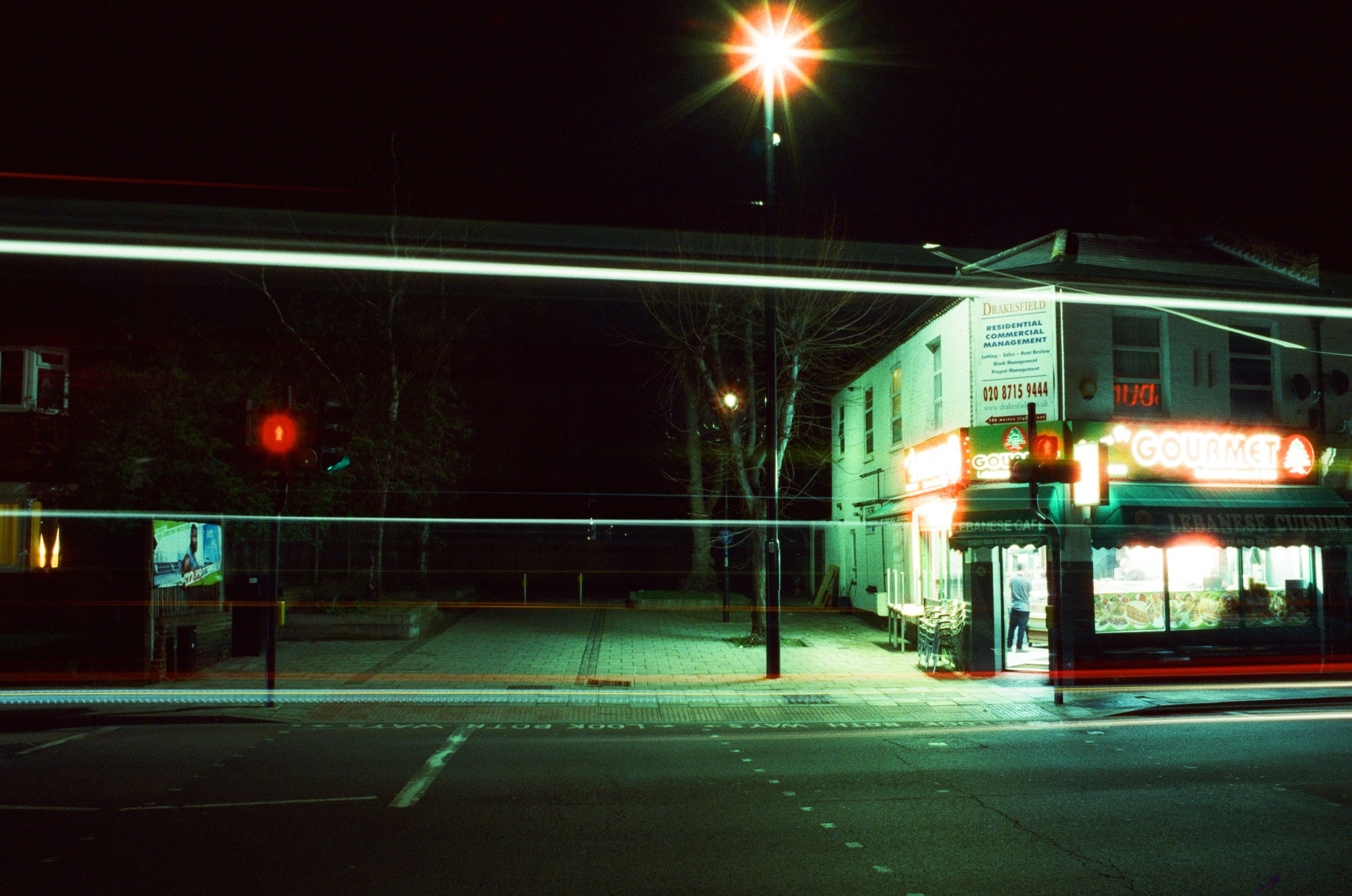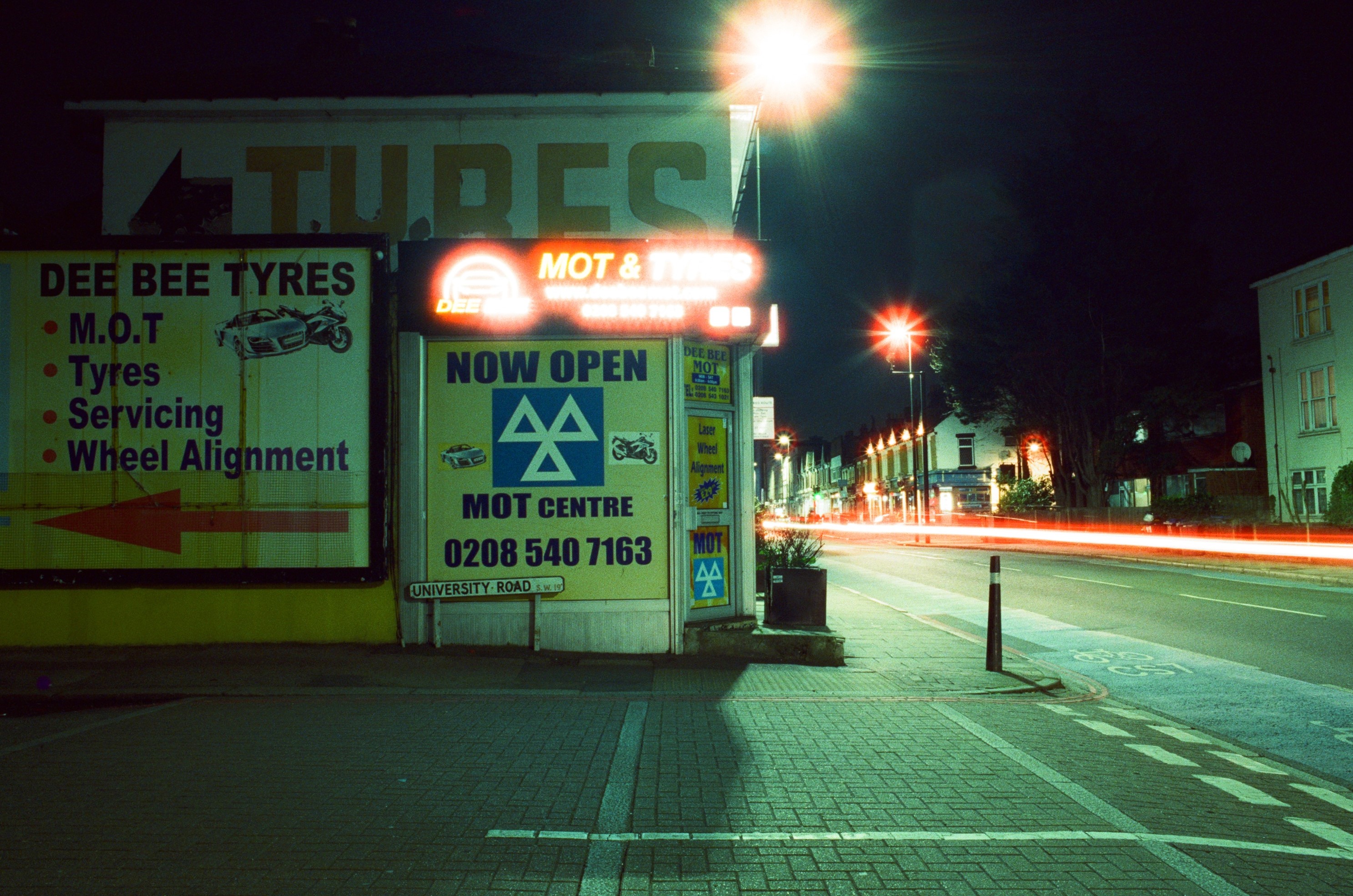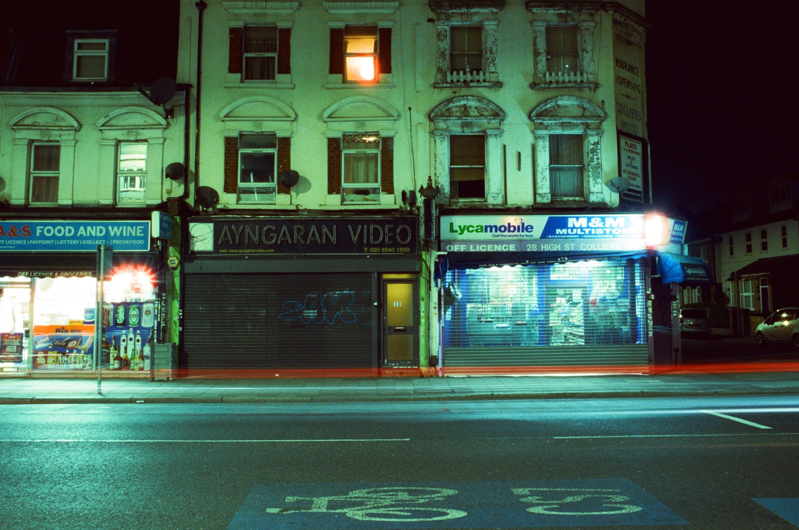 Colliers Wood After Dark London, 21 March 2020 Pentax K1000, 28mm + 50mm lenses, Cinestill 800T colour film