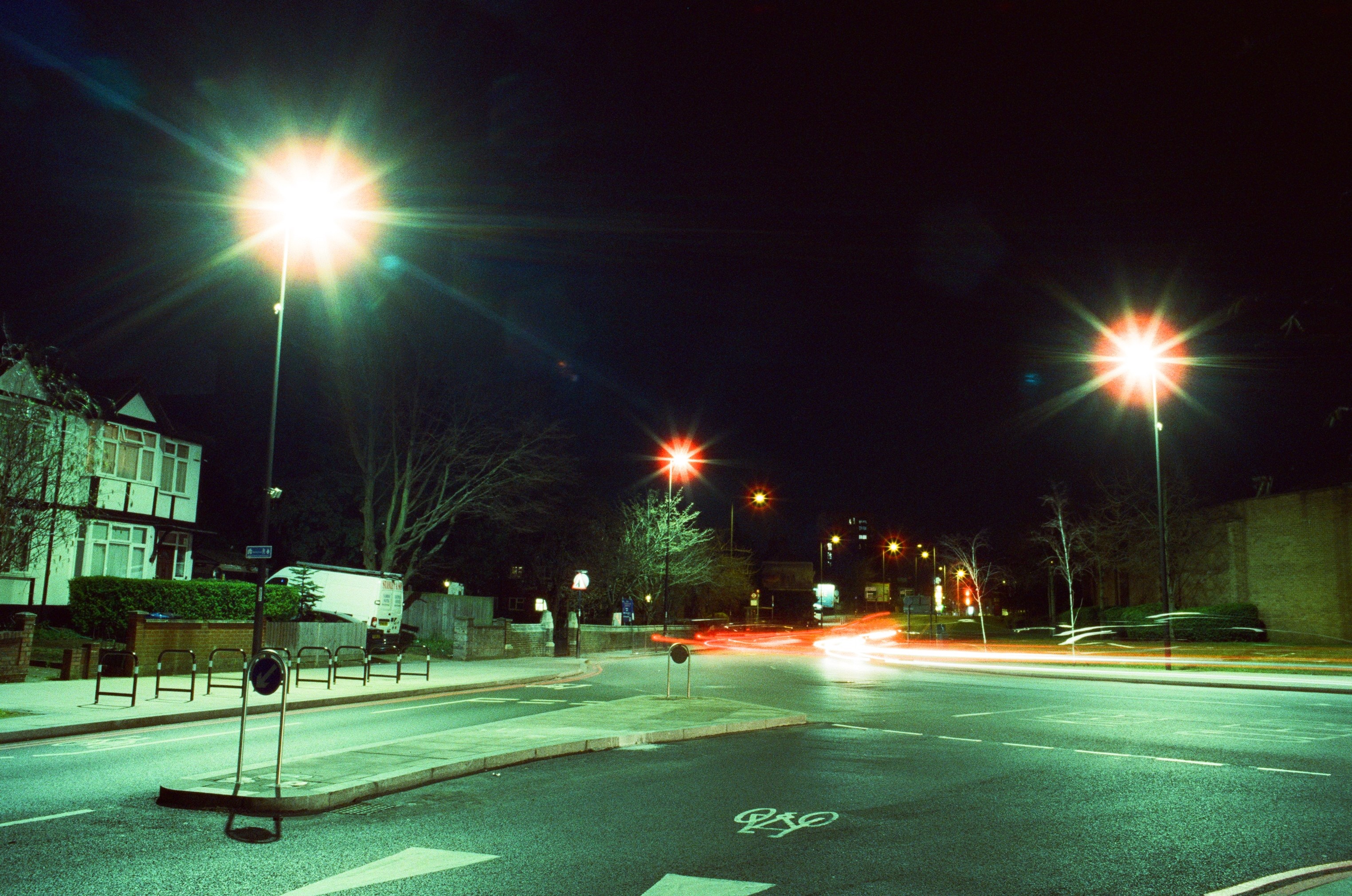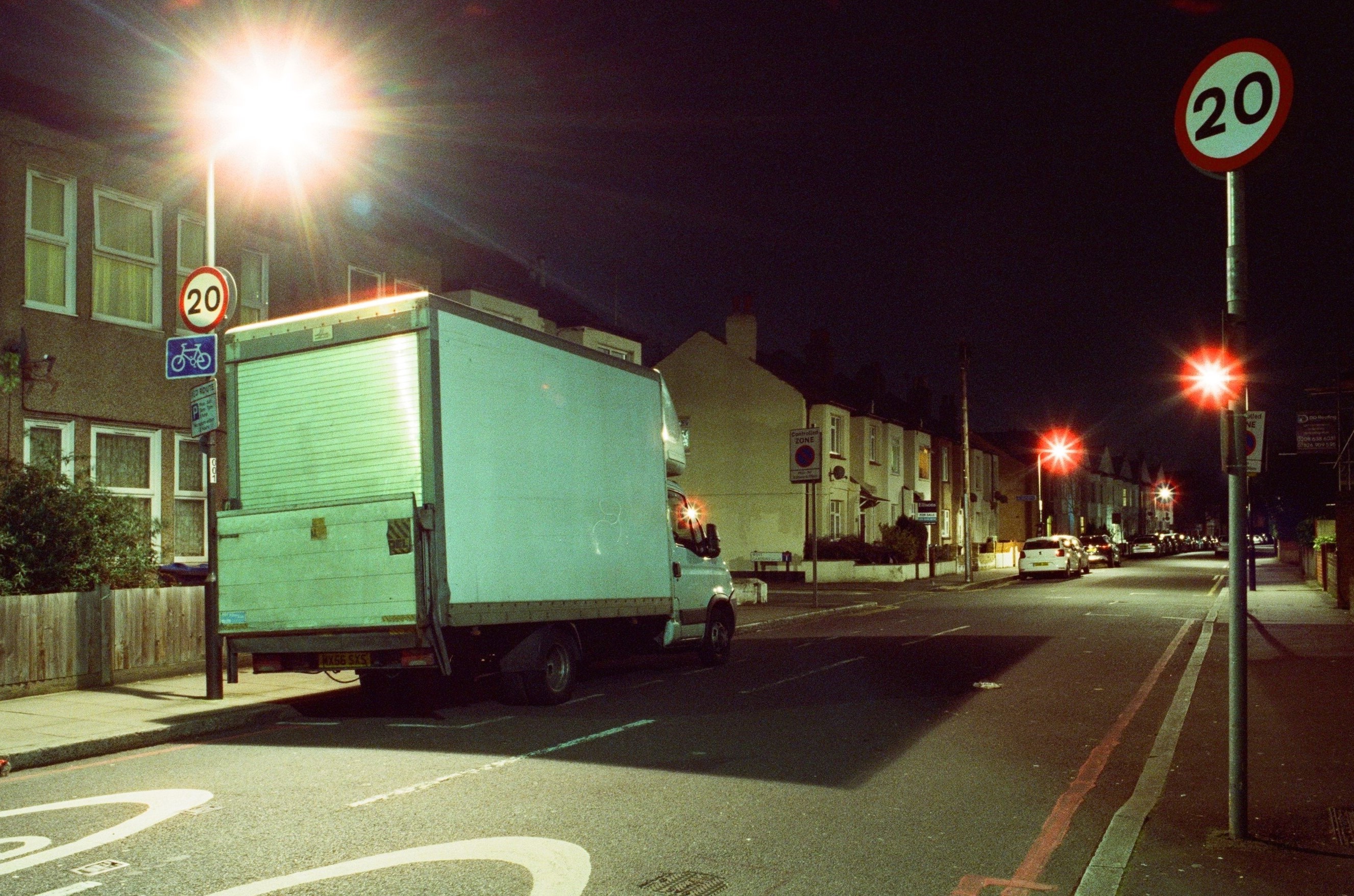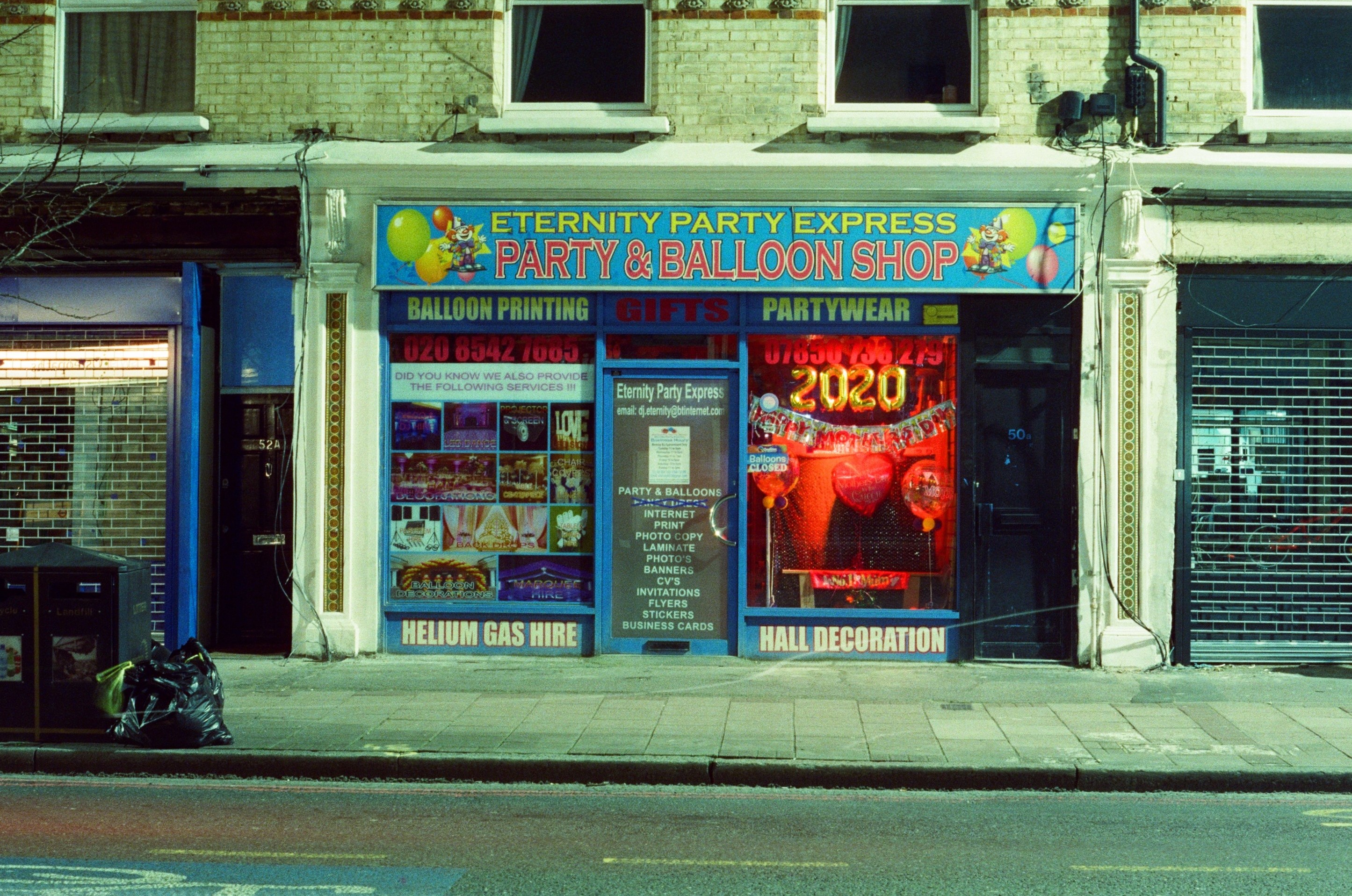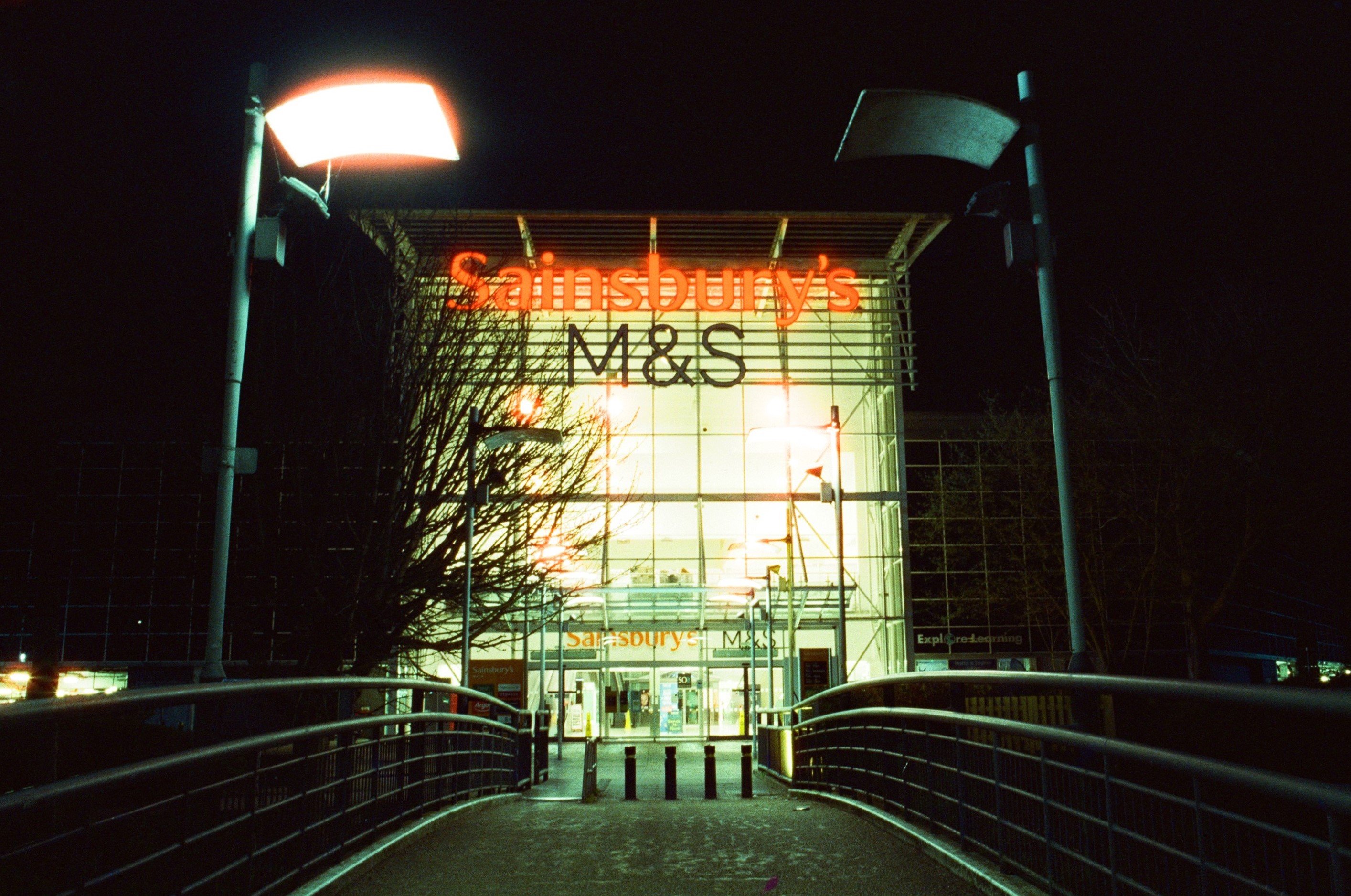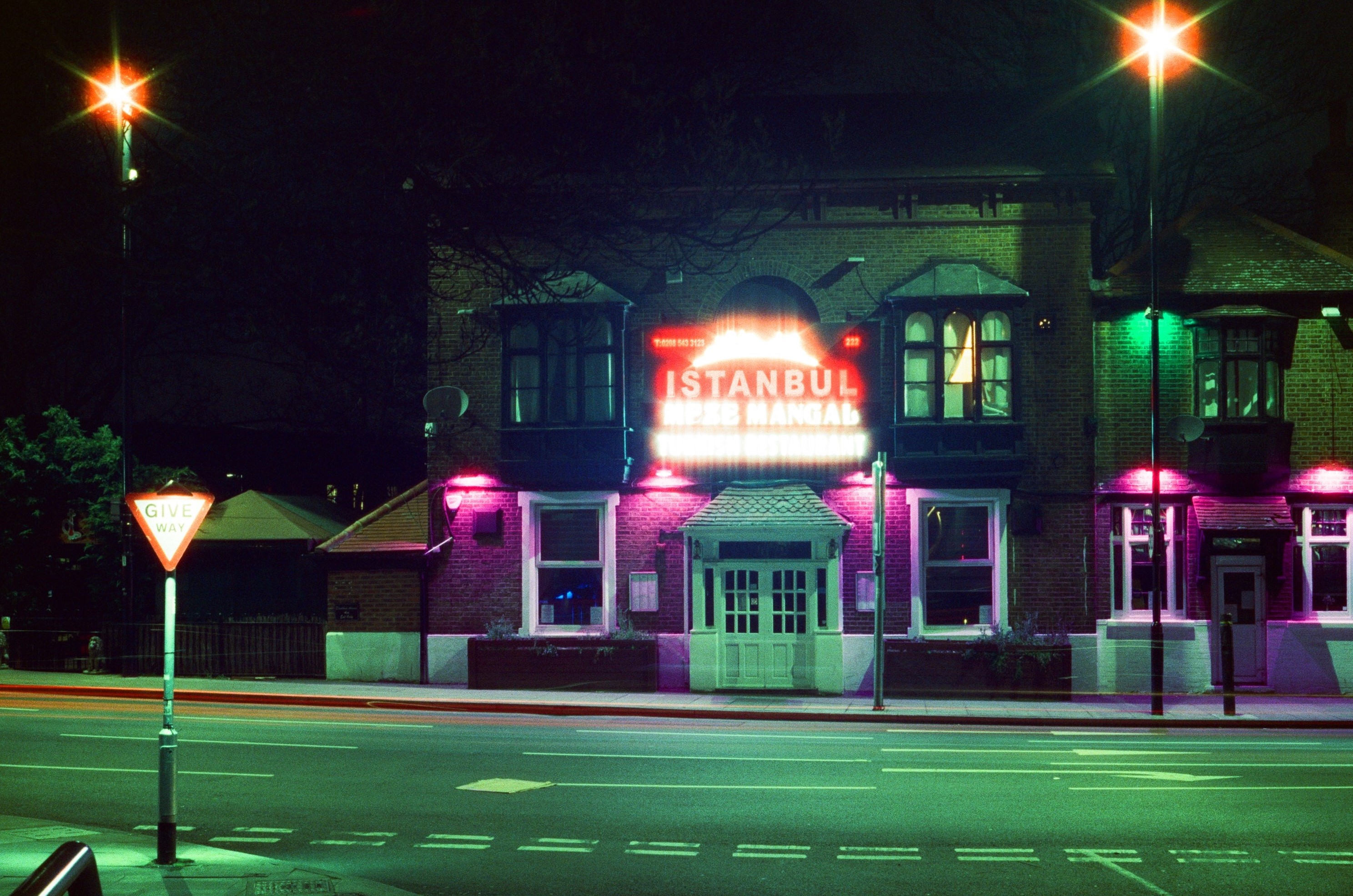 Colliers Wood After Dark London, 21 March 2020 Pentax K1000, 28mm + 50mm lenses, Cinestill 800T colour film